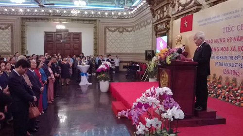 (VOV5) - Tối 29/8, Thành ủy, Hội đồng nhân dân, Ủy ban nhân dân và Ủy ban Mặt trận Tổ quốc Việt Nam Thành phố Hồ Chí Minh tổ chức gặp gỡ và mở tiệc chiêu đãi các cơ quan ngoại giao đoàn, đại diện các tổ chức quốc tế, hiệp hội doanh nghiệp nước ngoài và các tổ chức phi chính phủ tại Thành phố Hồ Chí Minh nhân dịp kỷ niệm lần thứ 69 Quốc khánh nước Cộng hòa xã hội chủ nghĩa Việt Nam (2/9/1945-2/9/2014).