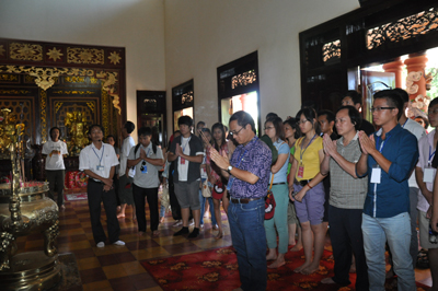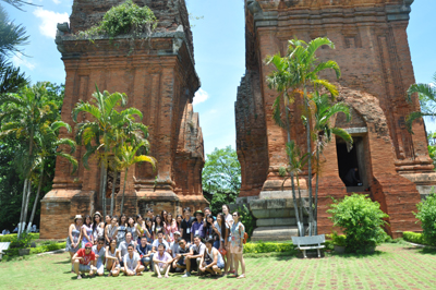 Ngay khi vừa đến nơi, các bạn trẻ đã tỏa ra các hướng để chụp được những bức ảnh đẹp về Tháp đôi Quy Nhơn. Em Phó Đức Dương từ Trung Quốc chia sẻ: “Được các anh chị hướng dẫn viên giới thiệu về Tháp đôi này, em không khỏi bất ngờ khi biết công trình kiến trúc này đã được xây dựng vào khoảng cuối thế kỷ XII đầu thế kỷ XIII, nghĩa là đã tồn tại từ rất lâu. Thật không ngờ với trình độ kỹ thuật thời đó mà có thể làm nên công trình kiến trúc hết sức độc đáo, đặc biệt như vậy. Ngày hôm nay, với hành trình đến tỉnh Bình Định đã giúp em có thêm hiểu biết về lịch sử và văn hóa ở Bình Định nói riêng cũng như cả nước nói chung. Mong rằng trong những ngày tới, chúng em sẽ tiếp tục được khám phá thêm những địa danh mới, để “làm giàu” vốn văn hóa Việt Nam của mình hơn”.