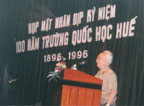 | Đại tướng Võ Nguyên Giáp phát biểu trong buổi họp mặt kỷ niệm thành lập Trường Quốc Học Huế nơi đại tướng đã từng học. (Ảnh: baomoi.com) |