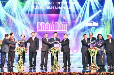 | Thủ tướng Nguyễn Tấn Dũng và các đại biểu bấm nút phát sóng chính thức Truyền hình Nhân Dân. Ảnh: LINH HẢI KHOA |