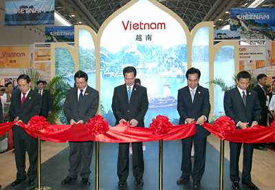 | Thủ tướng Nguyễn Tấn Dũng cắt băng khai trương khu gian hàng quốc gia Việt Nam tại CAEXPO (Ảnh:chinhphu.vn) |
