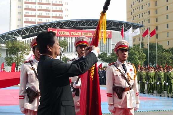 | Thủ tướng Nguyễn Tấn Dũng trong buổi lễ đón nhận danh hiệu Anh hùng lực lượng vũ trang nhân dân của Học viện Cảnh sát nhân dân. (Ảnh:anninhthudo) |