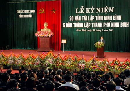 (VOV) - Sáng 30/3, tỉnh Ninh Bình tổ chức trọng thể Lễ kỷ niệm 20 năm tái lập tỉnh và 5 năm thành lập thành phố Ninh Bình. Phát biểu tại Lễ kỷ niệm, Thủ tướng Nguyễn Tấn Dũng đánh giá cao những nỗ lực và kết quả đạt được của Đảng bộ, chính quyền và nhân dân tỉnh Ninh Bình, đồng thời yêu cầu tỉnh Ninh Bình triển khai thực hiện có hiệu quả Nghị quyết Trung ương 4 “Một số vấn đề cấp bách về xây dựng Đảng hiện nay” gắn với đẩy mạnh phát triển kinh tế- xã hội. “Ninh Bình cần phát huy tinh thần năng động, sáng tạo, phát huy mọi tiềm năng, lợi thế của địa phương, huy động và sử dụng hiệu quả các nguồn lực trong và ngoài tỉnh để tạo ra những đột phá phát triển kinh tế nhanh, toàn diện, bền vững. Tiếp tục đẩy mạnh chuyển dịch cơ cấu kinh tế theo hướng hiện đại và hiệu quả hơn trên cơ sở áp dụng mạnh mẽ tiến bộ khoa học công nghệ vào sản xuất tạo ra sản phẩm có giá trị gia tăng cao, chủ động hội nhập quốc tế, chủ động tìm kiếm thị trường để mở rộng xuất khẩu. Ninh Bình cũng cần phát triển du lịch cảnh quan văn hóa lịch sử để trở thành một trong những trung tâm du lịch trọng điểm của quốc gia”.