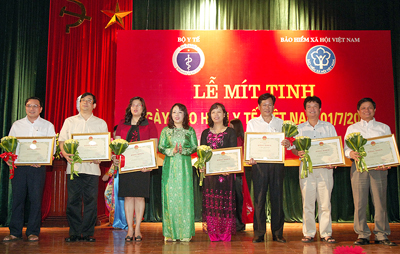 Bộ trưởng Y tế Nguyễn Thị Kim Tiến (thứ 4 từ trái sang) trao Bằng khen cho tập thể, cá nhân có thành tích trong thực hiện chính sách BHYT. Ảnh: VGP/Nhật Bắc