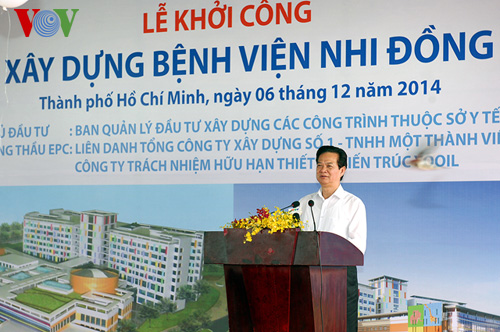 Phát biểu tại buổi lễ, Thủ tướng Nguyễn Tấn Dũng nhấn mạnh: xây dựng bệnh viện Nhi đồng TP Hồ Chí Minh tiến tiến, hiện đại sẽ trực tiếp giảm quá tải cho bệnh viện Nhi đồng 1 và 2, góp phần tăng cường công tác chăm sóc bảo vệ sức khỏe cho trẻ em, nâng cao chất lượng khám chữa bệnh chất lượng cao, kỹ thuật cao và hiệu quả cao cho trẻ em TP Hồ Chí Minh và khu vực phía Nam, gắn với nhiệm vụ đào tạo chuyên khoa nhi cho thành phố và cả khu vực… Trên tinh thần này, Thủ tướng Nguyễn Tấn Dũng yêu cầu lãnh đạo Bộ Y tế, thành phố Hồ Chí Minh cùng các bộ, ngành liên quan đẩy nhanh tiến độ để sớm triển khai xây dựng một số bệnh viện mới tại TP Hồ Chí Minh. Thủ tướng Nguyễn Tấn Dũng cũng yêu cầu chủ đầu tư, các đơn vị tư vấn, nhà thầu thi công dự án bệnh viện Nhi đồng TP Hồ Chí Minh tuân thủ các quy định của pháp luật và thực hiện nghiêm các cam kết trong hợp đồng, thực hiện dự án đảm bảo an toàn, chất lượng, đúng tiến độ 18 tháng đưa bệnh viện đi vào hoạt động với công nghệ tiến tiến ngang tầm khu vực, phục vụ nhu cầu khám chữa bệnh của người dân. Thủ tướng Nguyễn Tấn Dũng cũng lưu ý lãnh đạo TP Hồ Chí Minh chuẩn bị tốt nguồn nhân lực tiếp nhận và vận hành các trang thiết bị hiện đại, quản lý bệnh viện Nhi đồng TP Hồ Chí Minh đi vào hoạt động hiệu quả cao nhất./.
