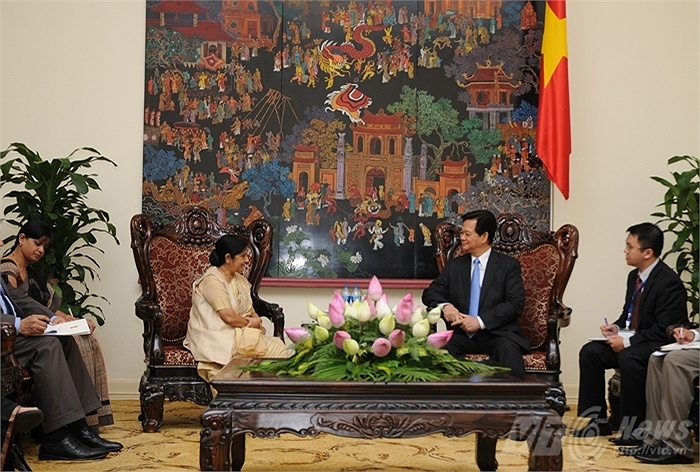 Sáng 25/8, tại Trụ sở Chính phủ, Thủ tướng Nguyễn Tấn Dũng tiếp bà Sushma Swaraj, Bộ trưởng Ngoại giao Ấn Độ, đang có chuyến thăm chính thức Việt Nam theo lời mời của Phó Thủ tướng, Bộ trưởng Ngoại giao Phạm Bình Minh. Đánh giá cao kết quả Hội đàm giữa 2 Bộ trưởng Ngoại giao hai nước, Thủ tướng Nguyễn Tấn Dũng cho rằng kết quả chuyến thăm này sẽ là đóng góp rất quan trọng trong việc thúc đẩy quan hệ hữu nghị truyền thống, đối tác chiến lược giữa Việt Nam và Ấn Độ. Thủ tướng Nguyễn Tấn Dũng khẳng định chính sách nhất quán của Việt Nam là làm hết sức mình, cùng với Ấn Độ đưa quan hệ hữu nghị, truyền thống tốt đẹp, lâu đời trên tinh thần đối tác chiến lược phát triển trên tất cả các lĩnh vực, đem lại lợi ích thiết thực cho nhân dân 2 nước, đóng góp vào hòa bình, ổn định, hợp tác và phát triển trong khu vực và trên thế giới. Bộ trưởng Sushma Swaraj cho biết Chính phủ mới của Ấn Độ khẳng định coi trọng hợp tác với Việt Nam và cho rằng Việt Nam có một vị thế ngày càng quan trọng trên thế giới. Bà Bộ trưởng cũng chuyển lời của Thủ tướng Narendra Modi mời Thủ tướng Nguyễn Tấn Dũng thăm Chính thức Cộng hòa Ấn Độ trong đầu tháng 10 tới để thảo luận về những phương hướng lớn trong quan hệ song phương. Cho rằng tiềm năng giữa hai nước còn rất lớn, bà Sushma Swaraj mong muốn hai bên nỗ lực để tăng cường hợp tác trên tất cả các lĩnh vực. Theo bà, Ấn Độ đánh giá cao về vị thế an ninh - quốc phòng của Việt Nam và mong muốn Việt Nam trở thành đối tác của Ấn Độ trong lĩnh vực này. Thủ tướng Nguyễn Tấn Dũng nhất trí với các đề xuất của Bộ trưởng Sushma Swaraj, đồng thời khẳng định Việt Nam nhiệt liệt chào đón Tổng thống Ấn Độ thăm Việt Nam vào tháng 9 tới, đồng cảm ơn Thủ tướng Narendra Modi mời Thủ tướng Việt Nam thăm chính thức Ấn Độ, cho đây là những sự kiện hết sức quan trọng để đưa quan hệ đối tác chiến lược Việt Nam - Ấn Độ tiếp tục phát triển lên những tầm cao mới.