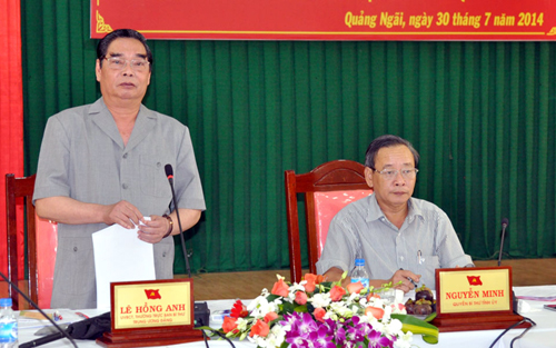 Ngày 30/7, ông Lê Hồng Anh, Thường trực Ban Bí thư có buổi làm việc với Ban thường vụ Tỉnh ủy Quảng Ngãi về tình hình thực hiện nhiệm vụ 6 tháng đầu năm, nhiệm vụ trọng tâm 6 tháng cuối năm 2014 và công tác chuẩn bị Đại hội Đảng các cấp.