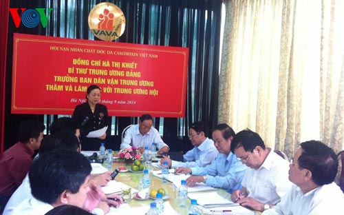 Hội nạn nhân chất độc da cam/dioxin Việt Nam đã tuyên truyền, vận động toàn xã hội tham gia vào các phong trào, hoạt động thiết thực giúp đỡ cuộc sống của nạn nhân và gia đình nạn nhân chất độc da cam/dioxin. Bà Hà Thị Khiết đề nghị Hội tiếp tục triển khai các hoạt động chăm sóc, giúp đỡ nạn nhân và gia đình nạn nhân nhiễm chất độc da cam/dioxin. Đồng thời, tham mưu cho Ban bí thư ra “Chỉ thị về đẩy mạnh giải quyết hậu quả chất độc hóa học do Mỹ sử dụng trong chiến tranh ở Việt Nam và công tác chăm sóc giúp đỡ nạn nhân chất độc da cam/dioxin Việt Nam”. Tính đến tháng 6/2014, đã có 250 nghìn người được hưởng chính sách đối với nạn nhân chất độc da cam, Hội đã thành lập Quỹ nạn nhân chất độc da cam/dioxin ở Trung ương và 33 tỉnh thành, vận động ủng hộ 800 tỷ đồng cho các nạn nhân chất độc da cam/dioxin. /.