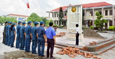 | Chiến sỹ Dân quân thị trấn Hiệp Hòa nghe nói chuyện truyền thống tại bia chiến thắng trận Hiệp Hòa (Ảnh: longan.gov.vn) |