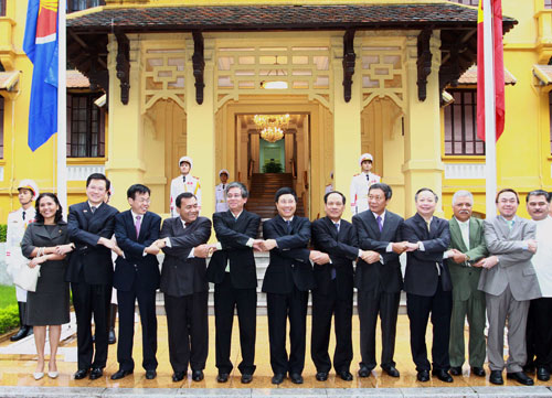 | Bộ trưởng Ngoại giao Việt Nam Phạm Bình Minh cùng Đại sứ các nước ASEAN tham dự buổi lễ thượng cờ ASEAN và Quốc kỳ Việt Nam. Ảnh: TTXVN. |