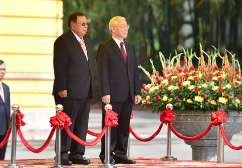 | Tổng Bí thư Nguyễn Phú Trọng chủ trì lễ đón chính thức Tổng Bí thư, Chủ tịch nước CHDCND Lào Bounnhang Vorachit (Ảnh: VietnamPlus) |