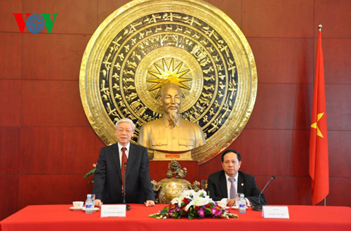 | Tổng Bí thư Nguyễn Phú Trọng nói chuyện với cán bộ, nhân viên Đại sứ quán và cộng đồng người Việt tại Trung Quốc |