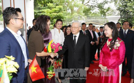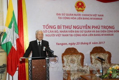 Trong khuôn khổ chuyến thăm cấp Nhà nước Myanmar, chiều 25/8, tại Yangon, Tổng Bí thư Ban chấp hành Trung ương Đảng Cộng sản Việt Nam Nguyễn Phú Trọng tới thăm Đại sứ quán Việt Nam tại Myanmar. Tổng Bí thư Nguyễn Phú Trọng cho biết chuyến thăm cấp Nhà nước Myanmar lần này đạt được mục đích, yêu cầu đề ra, trong đó hai bên đã nhất trí thiết lập khuôn khổ quan hệ hợp tác, đối tác toàn diện. Đây là bước chuyển về chất, tầm cao mới, chất lượng mới, cơ hội mới để hai bên thúc đẩy quan hệ phát triển mạnh mẽ hơn nữa.