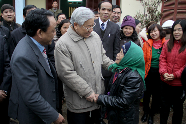 (VOV5) - Tiếp tục chuyến công tác tại các tỉnh Tây Bắc, ngày 6/1, Tổng Bí thư Nguyễn Phú Trọng thăm và làm việc tại huyện Mường Khương, tỉnh Lào Cai kiểm tra việc thực hiện các Nghị quyết của Đảng và nhiệm vụ năm 2012. Mường Khương là huyện nằm trong 62 huyện đặc biệt khó khăn của cả nước. Tại đây, có nhiều mô hình tốt về chuyển dịch cơ cấu kinh tế, xóa đói giảm nghèo như ở xã biên giới Bản Lầu. Từ năm 2010 đến nay, tỷ lệ hộ nghèo ở xã giảm được hơn 23%. Tại buổi làm việc, Tổng Bí thư Nguyễn Phú Trọng biểu dương những nỗ lực của xã Bản Lầu và huyện Mường Khương trong việc vận dụng sáng tạo để khai thác nguồn lực đất đai, con người một cách phù hợp, từng bước xóa bỏ các tập tục lạc hậu. Tổng Bí thư Nguyễn Phú Trọng nêu rõ: “Bây giờ người giàu phải giúp người nghèo. Đảng viên đã giàu thì giúp đảng viên còn nghèo, khó khăn hơn. Tất cả chúng ta phải sống trong công bằng, dân chủ”.
