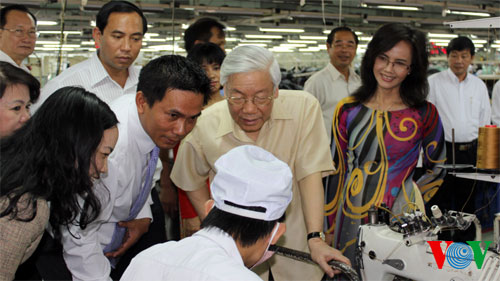 Buổi sáng 13/4, Tổng Bí thư Nguyễn Phú Trọng đã thăm một số cơ sở kinh tế của tỉnh Bình Dương. Tại Công ty trách nhiệm hữu hạn một thành viên may mặc Bình Dương, Tổng Bí thư đã ân cần thăm hỏi đời sống của cán bộ, công nhân công ty tại các xưởng sản xuất; thăm bếp ăn; khu nhà ở của công nhân và nhà trẻ.