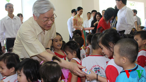 | Tổng Bí thư Nguyễn Phú Trọng chia quà cho các cháu thiếu nhi. |