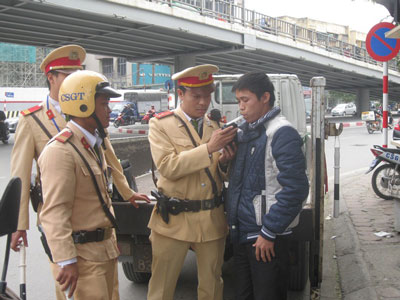 | Kiểm tra nồng độ cồn đối với tài xế xe tải tại Hà Nội Ảnh: Nguyễn Hưởng |