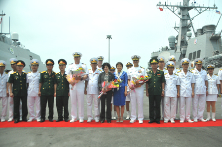 | Lãnh đạo Hải quân Việt Nam tặng hoa cho các đồng nghiệp phía Hoa Kỳ trong chuyến thăm Việt Nam, bắt đầu từ ngày 6/4, của hai chiến hạm Hải quân Hoa Kỳ. chinhphu.vn |