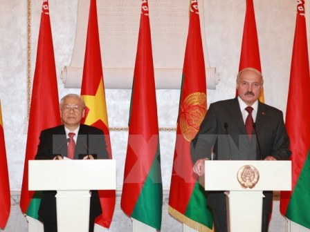 | Tổng Bí thư Nguyễn Phú Trọng và Tổng thống Belarus Lukashenko gặp gỡ và phát biểu với báo chí tại Minsk. (Ảnh: Trí Dũng/TTXVN) |