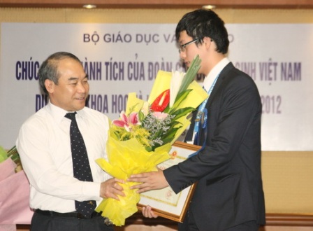 (VOV5) - Lễ trao tặng Bằng khen của Bộ trưởng Bộ Giáo dục Đào tạo cho 3 học sinh Việt Nam giành chiến thắng tại Cuộc thi Khoa học và Kỹ thuật Quốc tế (ISEF 2012) diễn ra tối 20/5 ngay tại lễ đón các em ở sân bay Nội Bài, Hà Nội. Đội học sinh Việt Nam gồm Trần Bách Trung, Bùi Thị Quỳnh Trang, Vũ Anh Vinh, học sinh trường Trung học phổ thông chuyên Hà Nội - Amsterdam đã vượt lên 1500 học sinh bậc Trung học phổ thông của 70 quốc gia giành giải Nhất Cuộc thi tổ chức tại Hoa Kỳ hôm 18/5 với đề tài “biến nước mặn thành nước ngọt”. Bộ Giáo dục và Đào tạo cũng trao tiền thưởng 10 triệu đồng/em. Đoàn Thanh niên Cộng sản Hồ Chí Minh tặng các em Huy hiệu “Tuổi trẻ sáng tạo”.