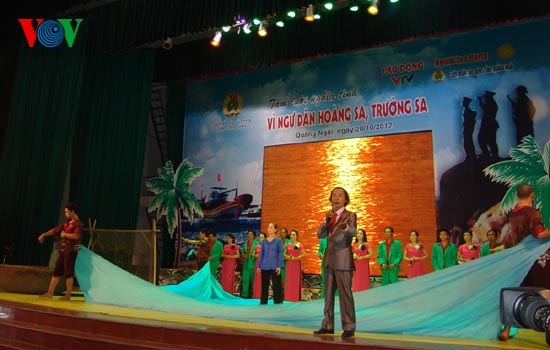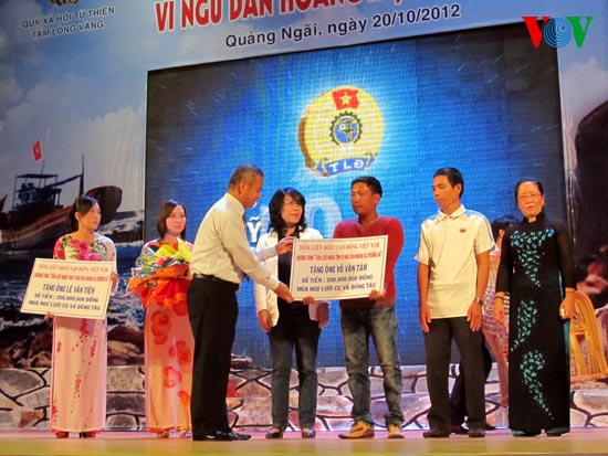 Như Đài TNVN đã tường thuật trực tiếp, sáng nay (20/10), tại Nhà Văn hóa Lao động tỉnh Quảng Ngãi, Tổng Liên đoàn Lao động Việt Nam đã giao cho Báo Lao động, Báo Người Lao động, Quỹ xã hội từ thiện Tấm lòng vàng, Liên đoàn Lao động tỉnh Quảng Ngãi phối hợp với Đài Truyền hình Việt Nam và các đơn vị liên quan tổ chức chương trình giao lưu “Tấm lưới nghĩa tình vì ngư dân Hoàng Sa, Trường Sa” và trao quà, tặng kinh phí hỗ trợ cho ngư dân gặp nạn trên biển tiếp tục có điều kiện vươn khơi bám biển.