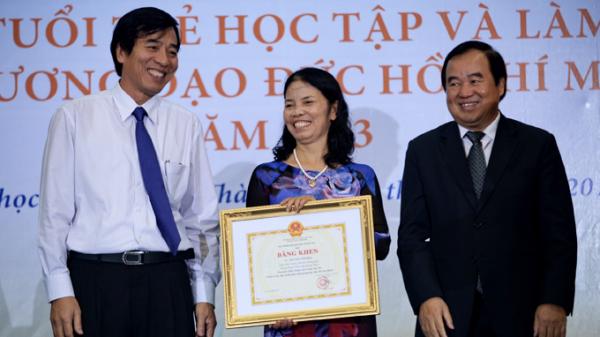 | Chị Nguyễn Thị Hòa (đứng giữa, giáo viên Trường tiểu học Hoàng Quế, tỉnh Quảng Ninh) trong niềm vui đoạt giải nhất cá nhân chung cuộc cuộc thi "Tuổi trẻ học tập và làm theo tấm gương đạo đức Hồ Chí Minh". Chị được tặng bằng khen của Bộ trưởng Bộ Giáo dục đào tạo và 10 triệu đồng - Ảnh: Quang Định |