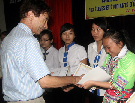 Giáo sư Odon Vallet trao học bổng cho học sinh giỏi Nghệ An. Ảnh: dantri.com.vn