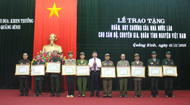 | Ông Nguyễn Hữu Hoài, Phó Bí thư Tỉnh ủy, Chủ tịch UBND tỉnh, Chủ tịch Hội đồng Thi đua-Khen thưởng tỉnh trao Huân chương, Huy chương cho các cá nhân và đại diện gia đình cán bộ, chuyên gia, quân tình nguyện Việt Nam. Ảnh theo:baoquangbinh.vn |