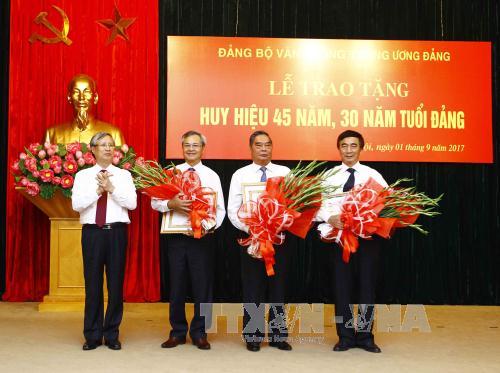Dự buổi lễ có ông Trần Quốc Vượng, Bí thư Trung ương Đảng, Thường trực Ban Bí thư, Chủ nhiệm Ủy ban Kiểm tra Trung ương; ông Nguyễn Quang Dương, Bí thư Đảng bộ Khối các Cơ quan Trung ương. Tại đây, thay mặt lãnh đạo Đảng, Nhà nước, ông Trần Quốc Vượng trao Huy hiệu 45 năm tuổi Đảng; ông Nguyễn Quang Dương trao Huy hiệu 30 năm tuổi Đảng tặng các đảng viên của Đảng bộ Văn phòng Trung ương Đảng.