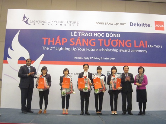 (VOV5) - Chiều 7/1, 60 sinh viên xuất sắc đã được nhận học bổng Thắp sáng tương lai 2013 tại Hà Nội và Thành phố Hồ Chí Minh. Mỗi suất học bổng trị giá 20 triệu đồng, gồm 10 triệu đồng tiền mặt, 10 triệu đồng là các học bổng cho các khoá học như chương trình Nền tảng kế toán của Hiệp hội kế toán công chứng Anh quốc (ACCA), các khoá huấn luyện kỹ năng mềm cần thiết cho phát triển nghề nghiệp do ACCA tổ chức, chương trình thực tập để tiếp xúc với môi trường làm việc tại công ty kiểm toán Deloitte Việt Nam.