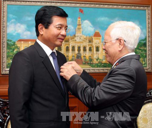 | Chủ tịch UBND Thành phố Lê Hoàng Quân trao Huy hiệu "Thành phố Hồ Chí Minh" cho Đại sứ đặc mệnh toàn quyền nước CHDCND Lào tại Việt Nam Somphone Sichaleune (Ảnh: TTXVN) |