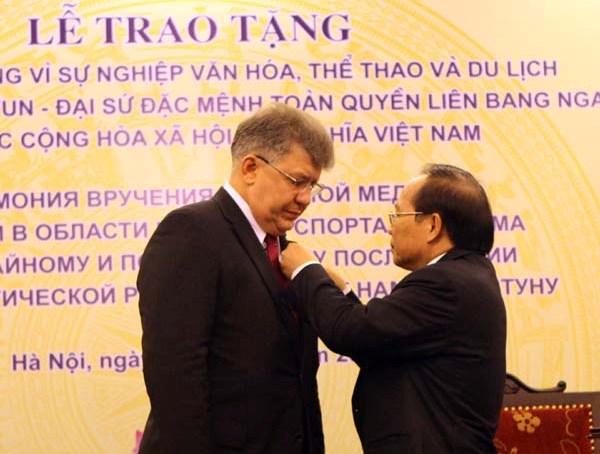 (VOV5) - Chiều 15/6, Bộ Văn hóa, Thể thao và Du lịch tổ chức Lễ trao Kỷ niệm chương Vì sự nghiệp Văn hóa, Thể thao và Du lịch - danh hiệu cao quý nhất của ngành Văn hóa, Thể thao & Du lịch Việt Nam - tặng Đại sứ đặc mệnh toàn quyền Liên bang Nga Andrey G. Kovtun.
