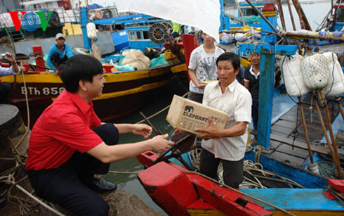 | Ông Đoàn Văn Thái - Phó Chủ tịch - Tổng thư ký Hội Chữ thập đỏ VN trao máy ICOM cho ngư dân Phan Thiết, Bình Thuận |
