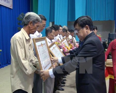 | Chủ tịch UBND tỉnh Long An Đỗ Hữu Lâm trao danh hiệu Bà mẹ Việt Nam Anh hùng cho các thân nhân Mẹ Việt Nam Anh hùng năm 2014. (Ảnh: Thanh Bình/TTXVN) |