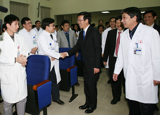 | Ông Võ Văn Thưởng chúc mừng tập thể cán bộ, thầy thuốc Bệnh viện K (Ảnh: suckhoedoisong.vn) |
