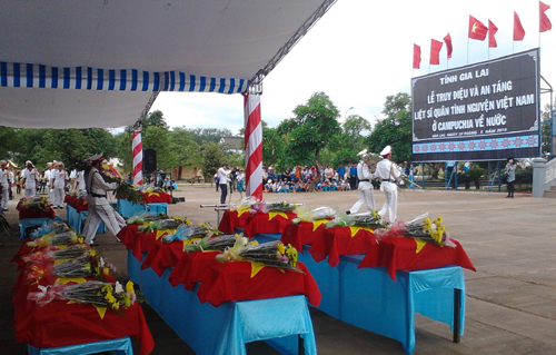 (VOV5) - Ngày 29/5, tỉnh Gia Lai đã tổ chức trọng thể Lễ đón nhận, truy điệu và an táng 30 hài cốt liệt sỹ quân tình nguyện, chuyên gia Việt Nam làm nhiệm vụ quốc tế, hi sinh tại chiến trường Campuchia.