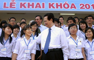 Cũng trong hôm nay, Thủ tướng Nguyễn Tấn Dũng dự lễ khai giảng năm học mới của trường Đại học Quốc gia thành phố Hồ Chí Minh. Thủ tướng yêu cầu, với trọng trách là một trung tâm đại học lớn trong hệ thống giáo dục đại học của cả nước, Đại học Quốc gia thành phố Hồ Chí Minh nỗ lực phấn đấu phát triển nhanh hơn nữa, đáp ứng được yêu cầu của một trung tâm đào tạo, nghiên cứu khoa học, chuyển giao công nghệ đa ngành, đa lĩnh vực chất lượng cao; đi đầu trong việc thực hiện chủ trương đổi mới căn bản toàn diện nền giáo dục quốc dân; tập trung cao nhất cho nâng cao chất lượng đào tạo, nghiên cứu khoa học, chuyển giao công nghệ, hợp tác quốc tế, sớm đưa Đại học Quốc gia thành phố Hồ Chí Minh đạt được trình độ quốc tế ở nhiều lĩnh vực hoạt động. Thủ tướng yêu cầu Đại học Quốc gia thành phố Hồ Chí Minh đặc biệt chú trọng nâng cao, tạo ra sự thay đổi rõ rệt về chất lượng đào tạo gắn với quyết liệt đổi mới nội dung chương trình và phương pháp dạy và học; tăng cường nâng cao trình độ chuyên môn, nghiệp vụ và đạo đức nhà giáo cho đội ngũ cán bộ, giảng viên; đẩy mạnh công tác nghiên cứu khoa học và chuyển giao công nghệ; tăng cường công tác hợp tác và liên kết đào tạo quốc tế, nhất là tiếp tục mở rộng liên kết đào tạo với các trường đại học tiên tiến, có uy tín trên thế giới theo các ngành mũi nhọn chiến lược… Thủ tướng Nguyễn Tấn Dũng nhấn mạnh: Trung tâm của giáo dục đào tạo là sinh viên, phải tạo điều kiện và tạo ra cách tự học, tự nghiên cứu cho sinh viên; phải chú trọng giáo dục nhân cách, lý tưởng, hoài bão cho học sinh sinh viên. Cùng với việc giáo dục trang bị kiến thức, kỹ năng chuyên môn, cần quan tâm đến giáo dục chính trị và phẩm chất đạo đức cho học sinh, sinh viên. Đảng và Nhà nước ta luôn quan tâm, chăm lo tạo điều kiện để học sinh, sinh viên nuôi dưỡng ước mơ, hoài bão, sáng tạo vươn lên và công hiến cho sự nghiệp xây dựng và bảo vệ Tổ quốc. Đất nước ta trải qua nhiều cuộc chiến tranh chống xâm lược, hàng triệu người con ưu tú của dân tộc đã anh dũng hy sinh. Ngày nay được sống trong độc lập, tự do, học tập và rèn luyện trong môi trường giáo dục ngày càng hoàn thiện, các thế hệ học sinh, sinh viên của chúng ta phải sống cho xứng đáng với sự hy sinh to lớn, cao cả của cha anh. Tôi mong rằng học sinh sinh viên , cá bạn, hãy phát huy truyền thống tốt đẹp của dân tộc, đi đầu trong học tập rèn luyện, không ngừng nâng cao trí thức, tiếp thu khoa học, công nghệ hiện đại và tinh hoa văn hóa của nhân loại, trở thành một lớp người trí thức mới vừa “Hồng” vừa “Chuyên” cống hiến ngày càng nhiều cho đất nước.