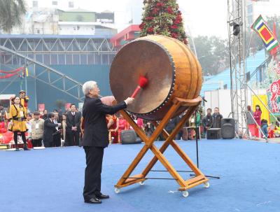 | Tổng Bí thư Nguyễn Phú Trọng đánh trống khai mạc Hội báo Xuân Ất Mùi 2015. Ảnh: Trí Dũng - TTXVN. |