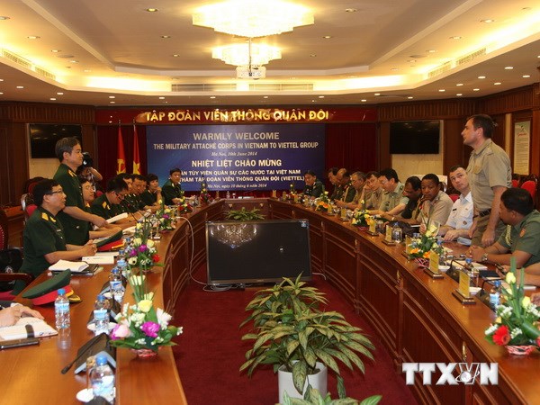 (VOV5) - Tại buổi tiếp ngày 10/6, Đại tá Hoàng Sơn, Phó Tổng giám đốc Tập đoàn Viettel thông báo với Đoàn Tùy viên Quân sự các nước về quá trình hình thành, phát triển của Tập đoàn.