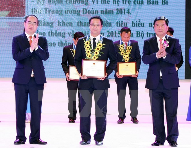 | Chủ tịch MTTQ Nguyễn Thiện Nhân và Bộ trưởng Bộ Giao thông Vận tải Đinh La Thăng trao chứng nhận cho các cá nhân được tuyên dương khen thưởng. (Ảnh: TTXVN) |