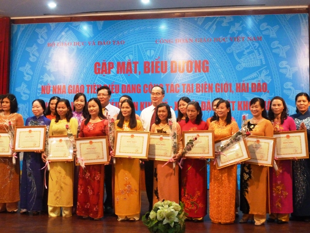 (VOV5) - Sáng nay (9/11), tại Hà Nội, Bộ Giáo dục và Đào tạo tổ chức gặp mặt, biểu dương 128 nữ nhà giáo tiêu biểu đang công tác tại biên giới, hải đảo, vùng cao, vùng có điều kiện kinh tế - xã hội đặc biệt khó khăn. 128 nữ nhà giáo được tuyên dương là những đại biểu ưu tú của đội ngũ nhà giáo đang công tác tại địa bàn biên giới, hải đảo, vùng cao, vùng đặc biệt khó khăn.