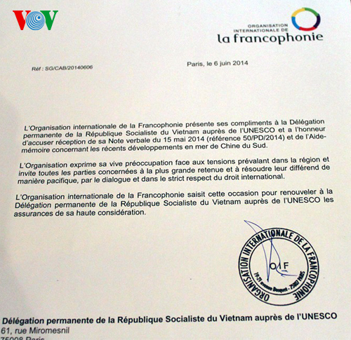 (VOV5) - Trước hành động vi phạm luật pháp quốc tế của Trung Quốc, ngày 6/6, Tổ chức quốc tế Pháp ngữ và Tổ chức UNESCO gửi công hàm cho Phái đoàn thường trực của Việt nam bên cạnh các tổ chức này. Hai công hàm bày tỏ sự quan ngại sâu sắc trước việc gia tăng căng thẳng trên biển Đông và kêu gọi tất cả các bên liên quan kiềm chế tối đa và giải quyết tranh chấp bằng con đường hòa bình, thông qua đối thoại và tuyệt đối tôn trọng luật pháp quốc tế.