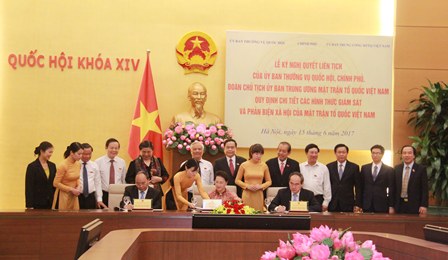 Chiều 15/06, tại Nhà Quốc hội, Ủy ban Thường vụ Quốc hội, Chính phủ, Đoàn Chủ tịch Ủy ban Trung ương Mặt trận Tổ quốc Việt Nam tổ chức Lễ ký Nghị quyết liên tịch quy định chi tiết các hình thức giám sát và phản biện xã hội của Mặt trận Tổ quốc Việt Nam. Chủ tịch Quốc hội Nguyễn Thị Kim Ngân, Thủ tướng Chính phủ Nguyễn Xuân Phúc, Chủ tịch Ủy ban Trung ương Mặt trận Tổ quốc Việt Nam, Bí thư Thành ủy thành phố Hồ Chí Minh Nguyễn Thiện Nhân tham dự lễ ký kết.