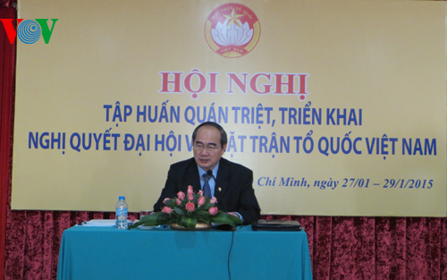 Sáng nay (27/01), tại thành phố Hồ Chí Minh, Chủ tịch UBTW MTTQ Việt Nam Nguyễn Thiện Nhân chủ trì Hội nghị tập huấn quán triệt, triển khai Nghị quyết Đại hội lần thứ 8 Mặt trận Tổ quốc Việt Nam (nhiệm kỳ 2014-2019) trong hệ thống Mặt trận các cấp.