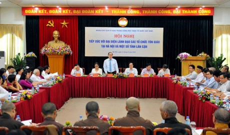 Chiều nay (4/9), tại Hà Nội, Đoàn Chủ tịch Ủy ban Trung ương Mặt trận Tổ quốc Việt Nam do ông Nguyễn Thiện Nhân, Chủ tịch Ủy ban Trung ương Mặt trận Tổ quốc Việt Nam chủ trì, tiếp xúc với đại diện lãnh đạo các tổ chức tôn giáo trên địa bàn Hà Nội và một số tỉnh lân cận, góp ý dự án Luật tín ngưỡng, tôn giáo.