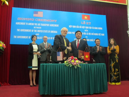 (VOV5) - Ngày 13/12, tại Hà Nội, Bộ trưởng Bộ Giao thông Vận tải Đinh La Thăng và Đại sứ đặc mệnh toàn quyền Mỹ tại Việt Nam David Shear đã ký kết Hiệp định sửa đổi Hiệp định vận tải hàng không.
