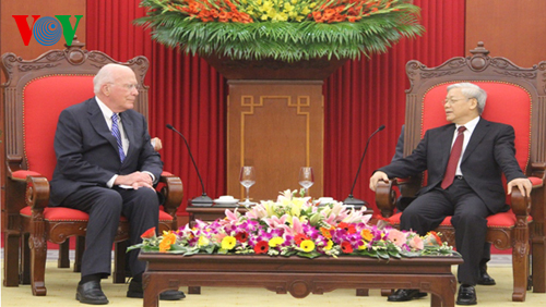 (VOV5) - Chiều 17/4, tại Trụ sở Trung ương Đảng, Tổng Bí thư Nguyễn Phú Trọng tiếp Đoàn đại biểu cấp cao Thượng viện Hoa Kỳ do Chủ tịch Thường trực Thượng viện Hoa Kỳ Patrick Leahy dẫn đầu đang ở thăm Việt Nam.