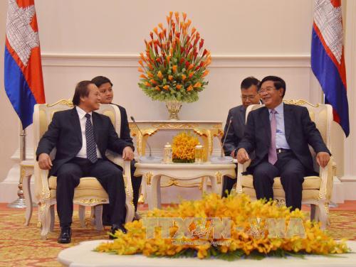 | Bộ trưởng Trương Minh Tuấn chào xã giao Thủ tướng Hoàng Gia Campuchia Samdech Hun Sen. Ảnh: Phan Minh Hưng-P/v TTXVN tại Phnom Penh. |