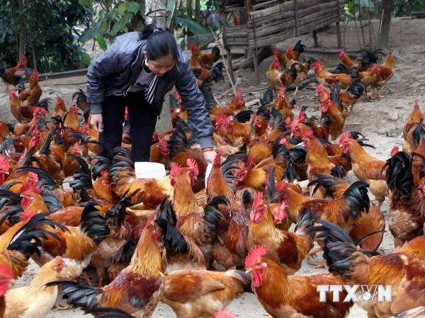 | Chăm sóc đàn gà thương phẩm của hộ gia đình. (Ảnh: TTXVN) |