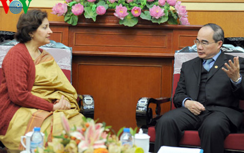(VOV5)- Chiều nay, 29/1, tại Hà Nội, Ủy viên Bộ Chính trị, Chủ tịch Ủy ban Trung ương Mặt trận Tổ quốc Việt Nam Nguyễn Thiện Nhân tiếp Đại sứ Ấn Độ tại Việt Nam bà Preeti Saran đến chào nhân kết thúc nhiệm kỳ công tác.